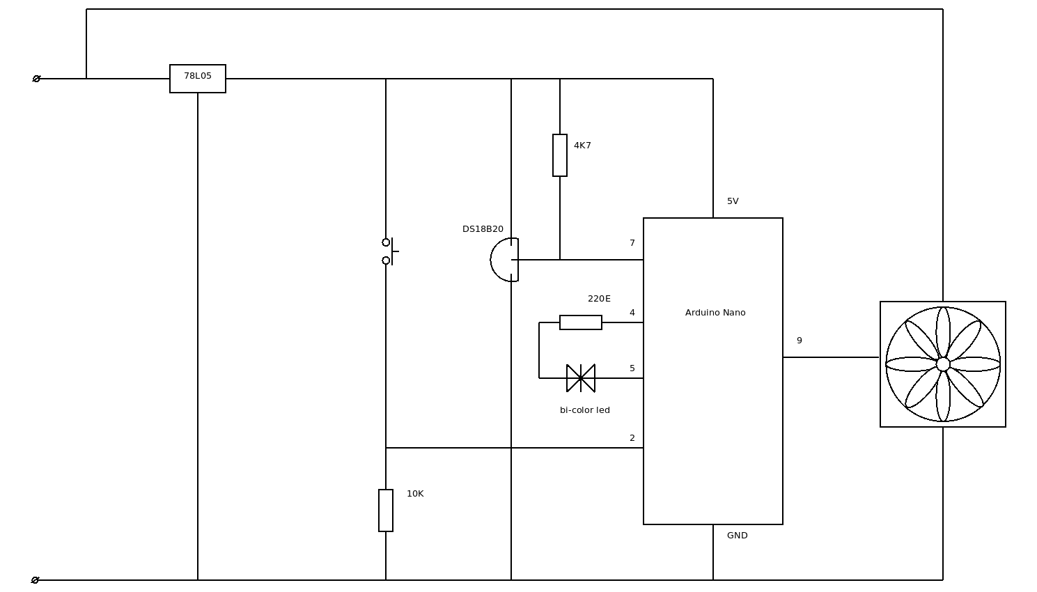 Arduino Nano Microcontroller Weerstand 10k tbv pull-up schakelaar Weerstand 4k7 tbv pull-up DS18b20 Weerstand 220E tbv bicolor led DS18b20 Digitale temperatuur sensor 78L05 5V spanningsregelaar bi-color led behuizing stukje print