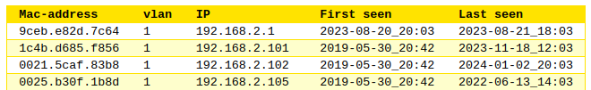 $ mac-invent2.py Toegevoegd: 0001.8082.e319 1 192.168.3.107 Toegevoegd: 7cdd.909b.da2e 2 192.168.5.105 Toegevoegd: b827.ebf4.01a5 2 192.168.5.106 Timestamp : 2024-02-11_11:02 Records updated: 52 Records added : 3 Total records : 208 total time : 1.20 $ mac-invent-cleanup.py 2024-02-11: opruimen alle entries ouder dan 2 jaar? (J/N)J 000c.2954.aeea 192.168.3.23 opgeruimd 0418.d607.d0b0 192.168.3.250 opgeruimd 268e.e0b6.8c9c 192.168.3.28 opgeruimd $ mac-invent-cli.py 192.168.5.105 Mac: Vl: IP: Eerst_gezien: Laatst_gezien: 7cdd.909b.da2e 2 192.168.5.105 2024-02-11_11:02 2024-02-11_11:02 Results: 1